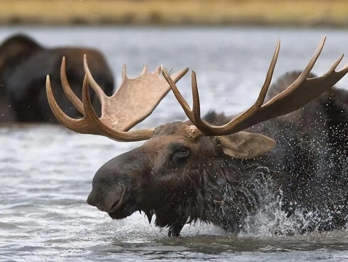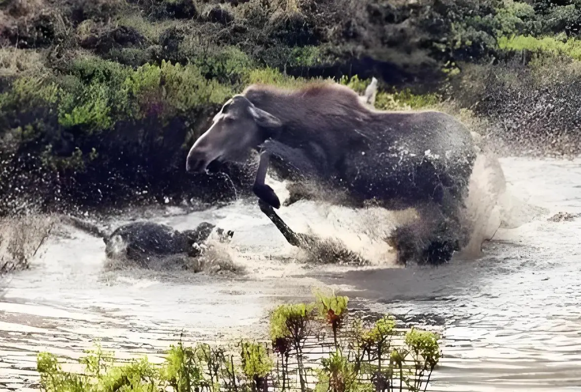 当时这只驼鹿被狼追逐时,它迅速转向河流,直接冲入水中。驼鹿的长腿让它在水中行走不成问题,而狼的短腿就不一样了,它们在水中行动的行动瞬间就受到了影响,无法再有效追击。这种利用水域逃生的策略,在许多驼鹿的被捕猎案例中都被多次验证。